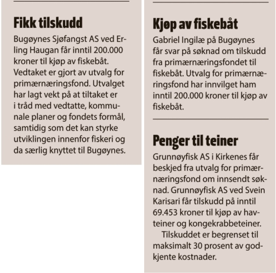 Grasrotandelen fra Norsk Tipping i 2025: Bugøynes helselag, 59 givere kr 32 264,45. Bugøynes bygdelag, 3 givere kr 333,04. IL Bølgen, 54 givere kr36 133,82. Kafe Ro Kirkenes, 28 givere kr 46 467,85.