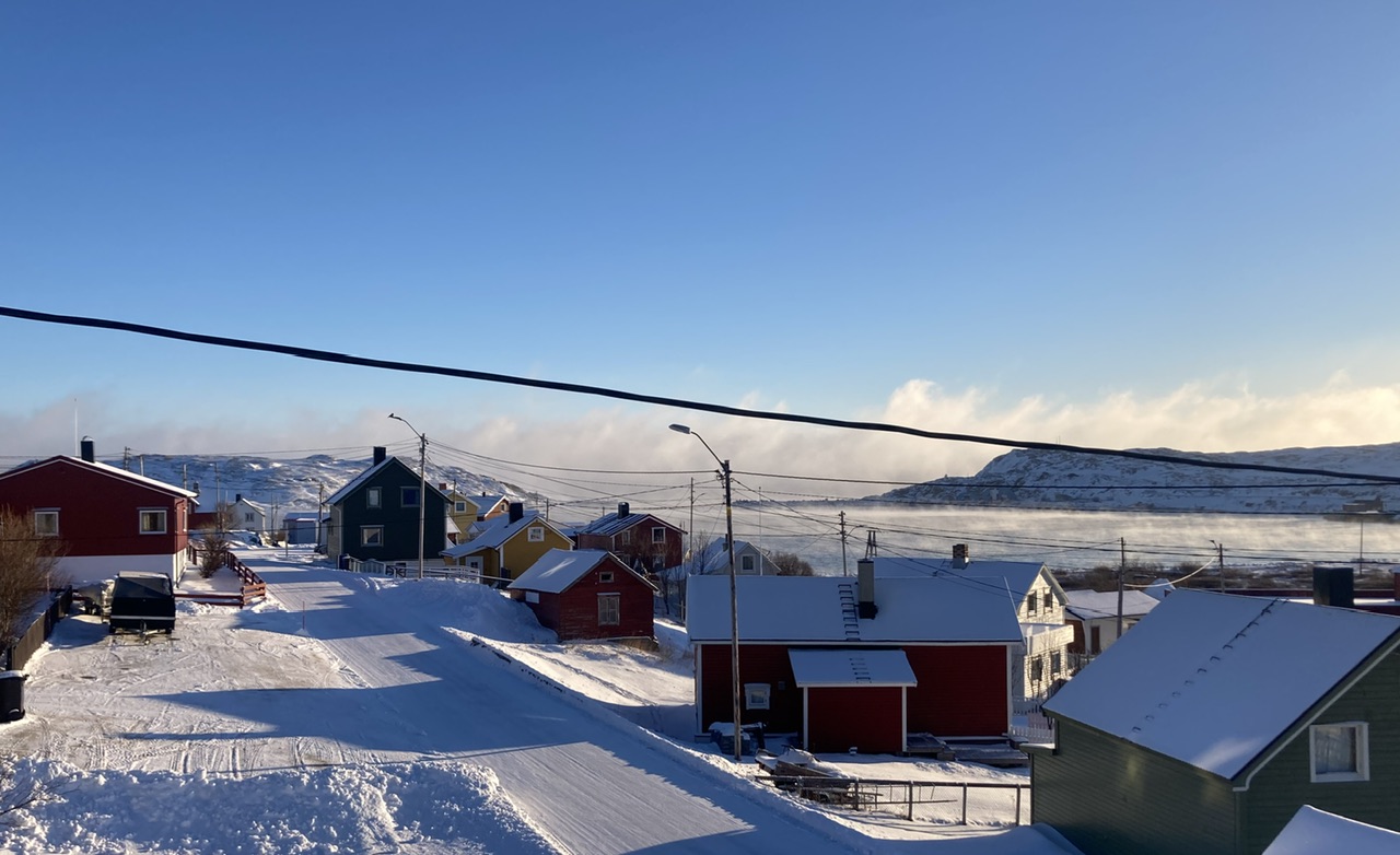 Bugøynes i dag kl 11:09. Da er sola tilbake på solsida i bygda. Minus 3 grader og liten kuling fra nordvest.