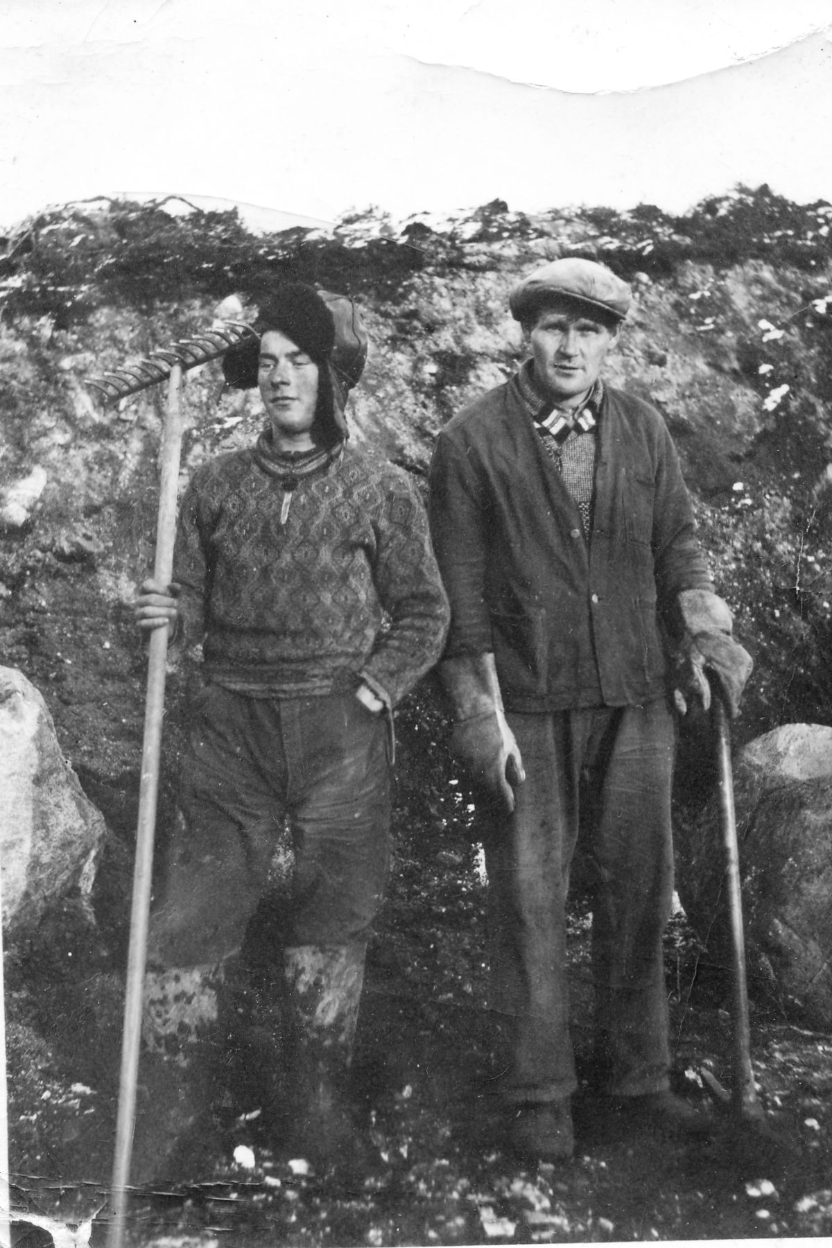Edvin og Leonard Marjavara frakter fisk som skal henges til tørk på hjell. Bildet er tatt ved nordre molo, Møljænmukka (Jussinfierua), der Finn Hjalmar Seipæjærvi og Vidar Hansen nå har fiskehjeller. Dette er fra tida før kongekrabben invaderte fjorden og snudde opp ned på lønnsomheten for sjarkfiskerne. Fra en tid som på grunn av kobbeinvasjonen og overfiske sendte mange fiskere på land for godt. Men noen holdt ut og mye fisk ble hengt privat. Båten disse to fisket med var først Alpen, og senere NyAlpen. Foto: VEI