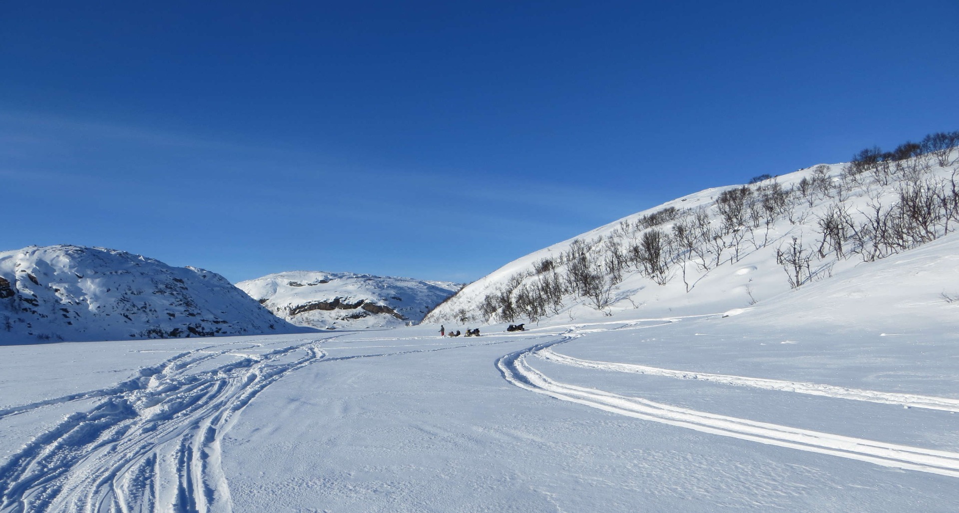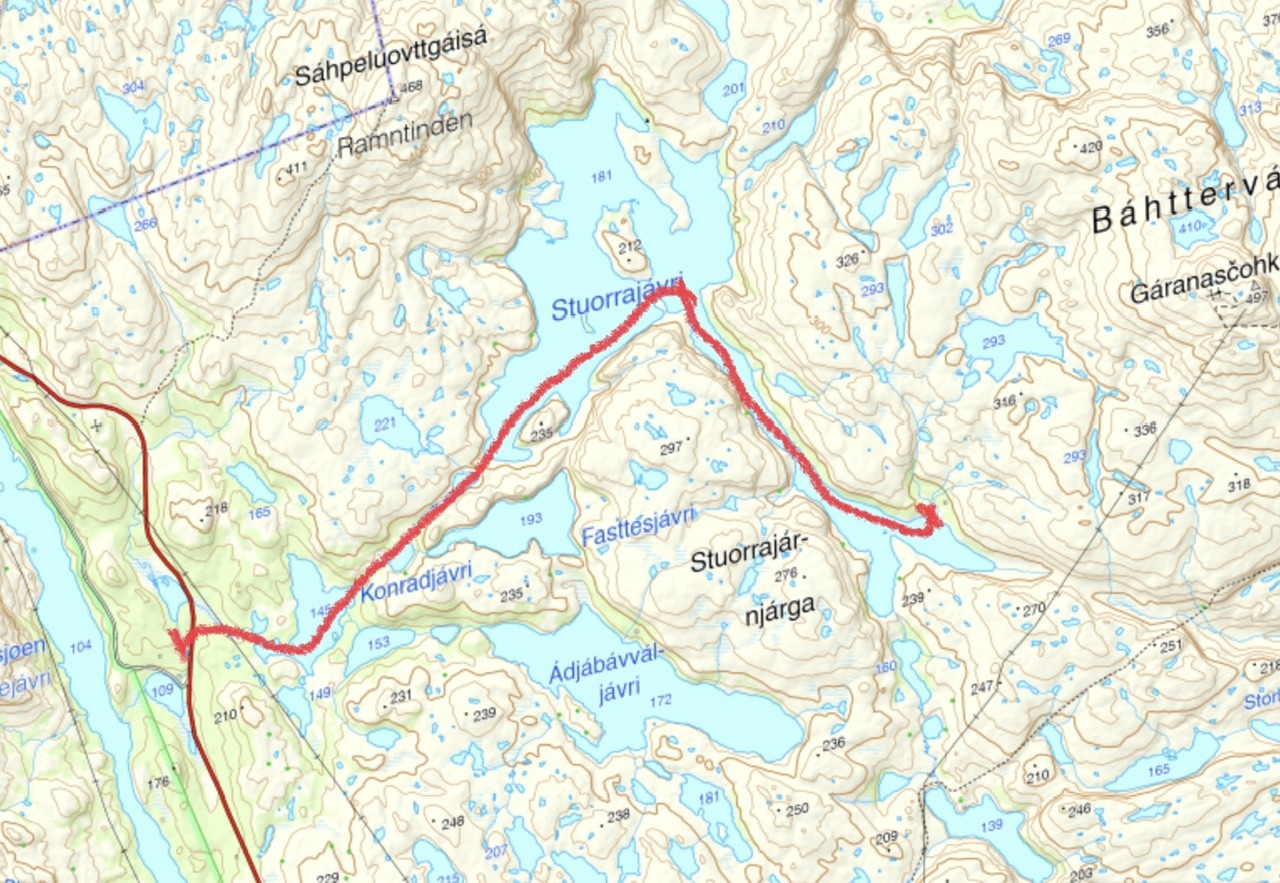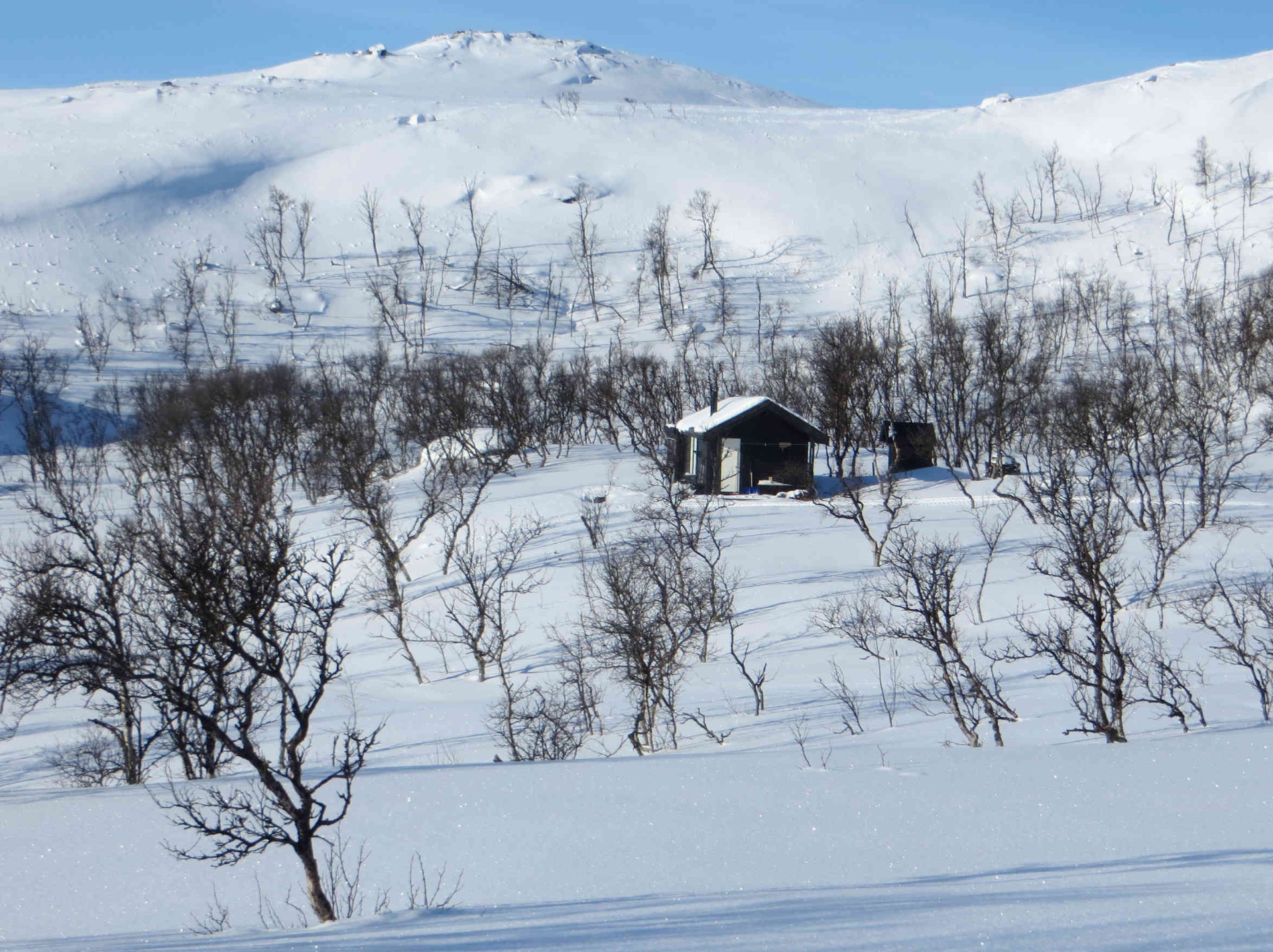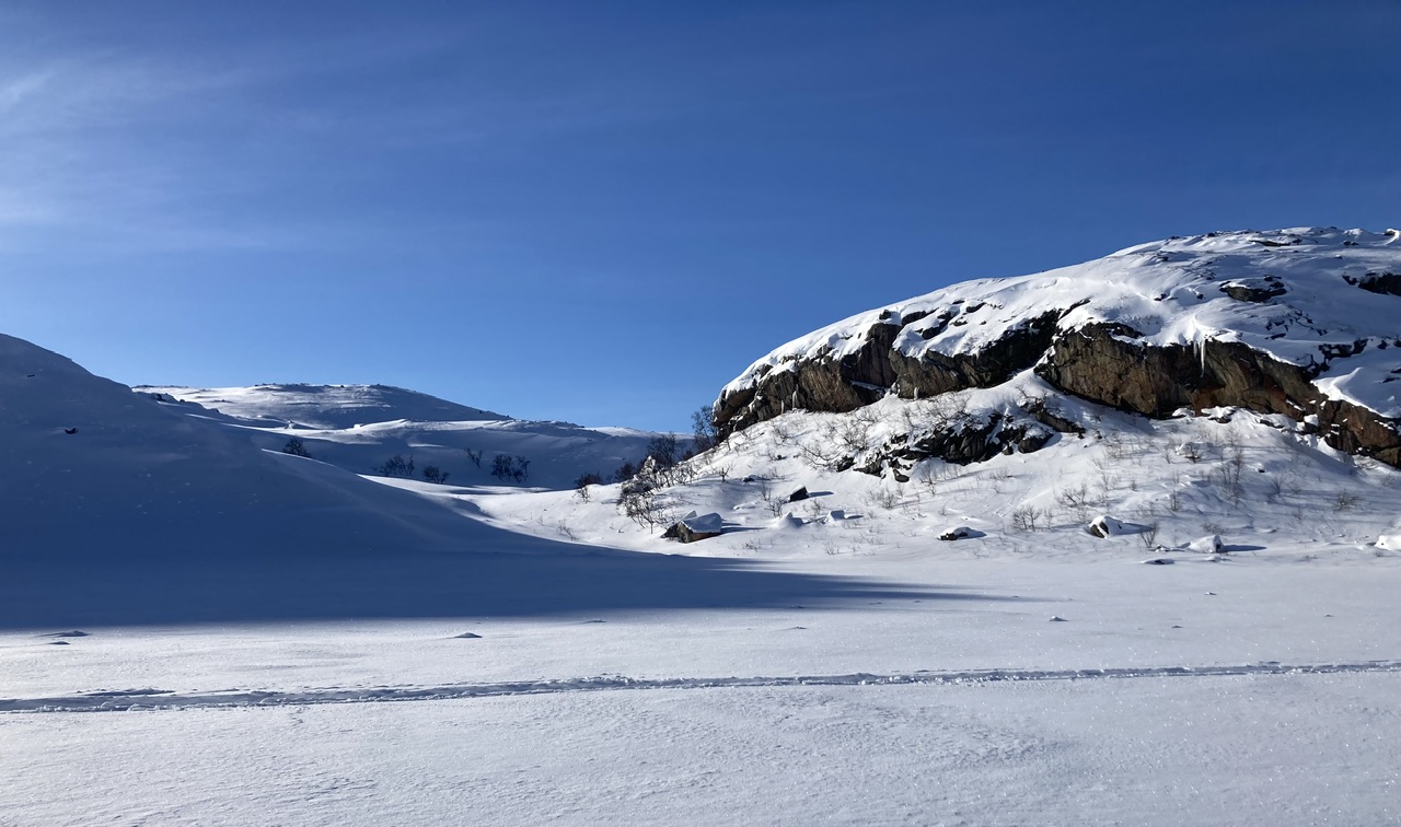 Da var tida for vinterens skiturer innledet. Onsdag i glimrende vær, sol fra en knallblå himmel og et par kuldegrader uten et vindpust. Som vanlig gikk turen opp fra parkeringsplassen ved E6 i Korsbekken. Før meg hadde AVINOR sendt folk opp til flyradaren så jeg kunne følge sporene uten å måtte tråkke løye sjøl. Kanskje derfor ble også turen lengre enn planlagt. Planen var egentlig at årets første skitur skulle gå litt oppover dalen til Lahenjærvi, kanskje til Vælitalo/Skimlidhytta og tilbake igjen. Men været var som sagt bra, meget bra, løypa lå rett foran meg, så da var det bare å følge sporene og beregne kreftene riktig så man også kom seg tilbake til bilen i rimelig tid og fortsatt i brukbar form.
