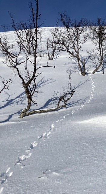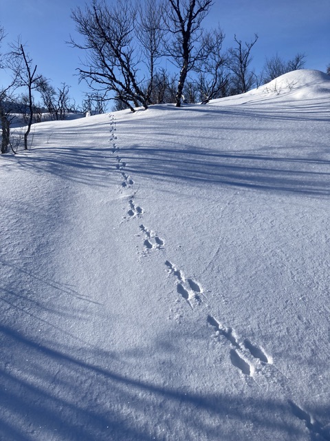 Noe dyreliv av betydning opplevde jeg ikke underveis, hørte en ravn langt borte et sted og så spor av rev og hare og muligens en elg som i løpet av natta hadde krysset området jeg gikk gjennom.