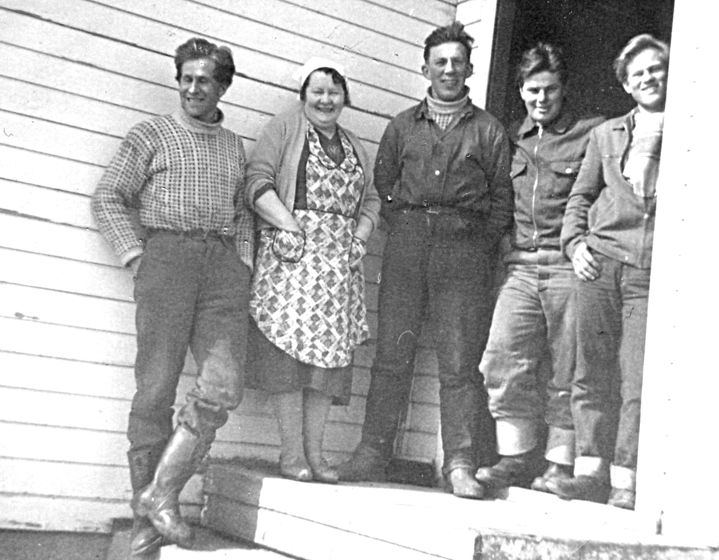 Fortsatt er det bare noen små krabbeleveringer som registreres av leveringer ved bruket i Bugøynes. Dagens bilde viser fra venstre Valter Marjavara, kvinnelig kokk, Svein Seipæjærvi, Leonard Marjavara og Oddvar Mudenia. Bildet er kanskje fra slutten av 1950-årene, og er tatt under juksafiske i Kiberg. Guttene er mannskap på båten Heimstrand av Bugøynes som tilhørte Seipæjærvislekta i Pipola. Foto: Ukjent
