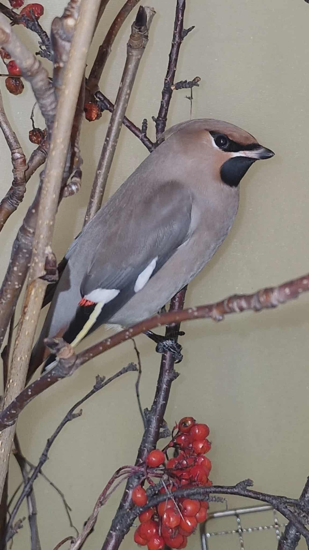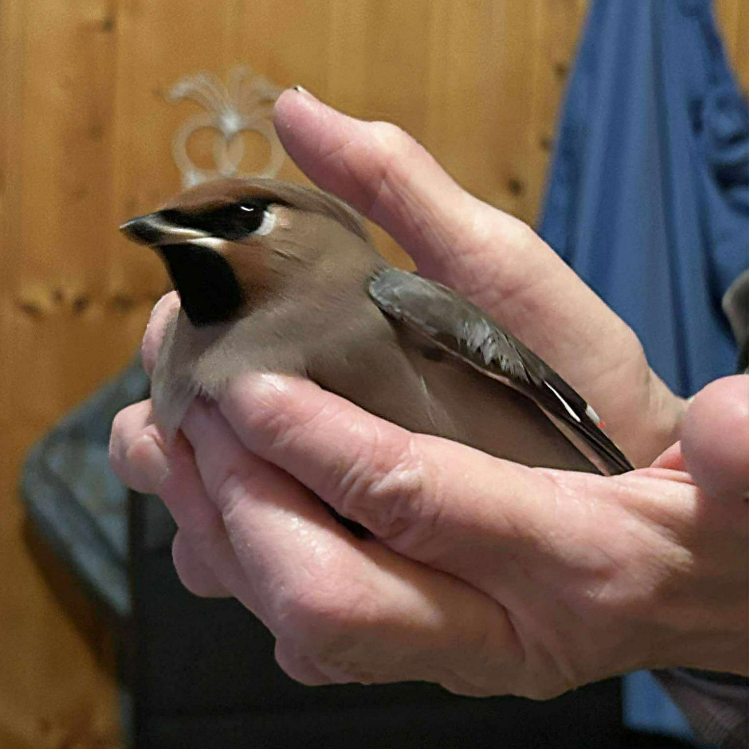 Så skjedde det nok en gang, den 21. november. Et smell i vinduet. En vakker sidensvans lå på rygg og peste med åpent nebb. Gemalen la den forsiktig i riktig posisjon. Og holdt et øye med den. Etter en stund gjorde den seg klar til å røre på seg. Da ser gemalen at høyre vinge ikke er ok. Den er ikke knekt, men vil ikke posisjonere seg. Vi lar den være i fred. Etter gjentatte fortvilende forsøk så finner vi ut at den må ha hjelp til å komme seg. Og vi velger å ta den inn i huset.