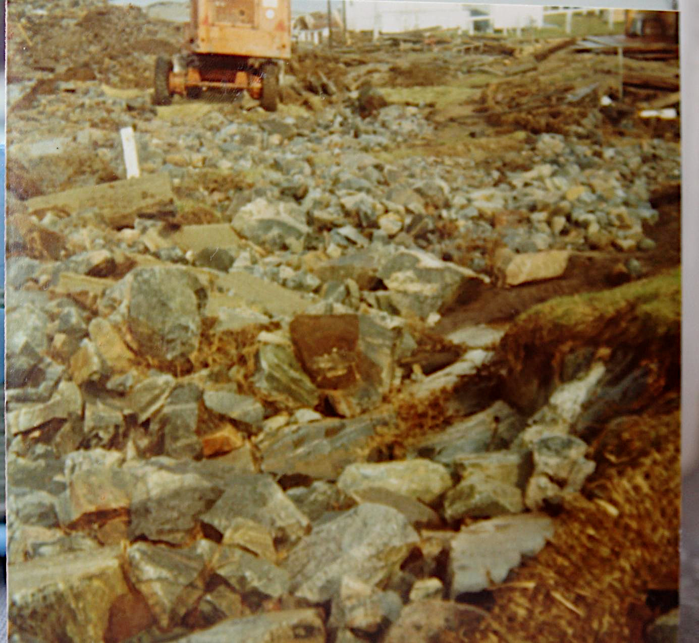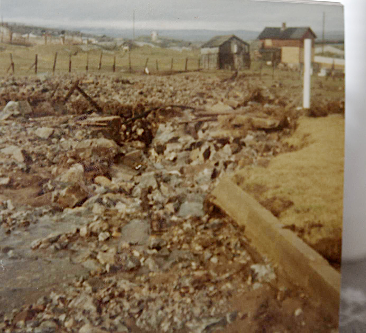 Landskapet i Pipola ble endret i løpet av noen få sekunder. Bekken som renner ned midt i Pipola, var ikke lenger en bekk, den var borte og rant et sted dypt under grusmassene. Erling Ingilæs nye hagegjerde forsvant, slåttemarka på den andre siden av bekken var blitt erstattet av grus og sand. (Foto: Ruth Ingilæ)