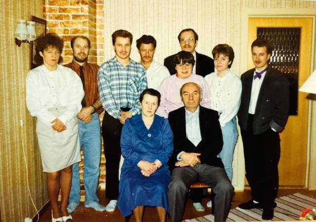 Familien Seipajrvi; bak fra venstre Turid, Øyvind, Tor Åge, Hans, Torun, bak står Valter, Vilgun og Sten Roger. Sittende foran ekteparet Eva og Ola Seipajærvi. (Foto Privat).