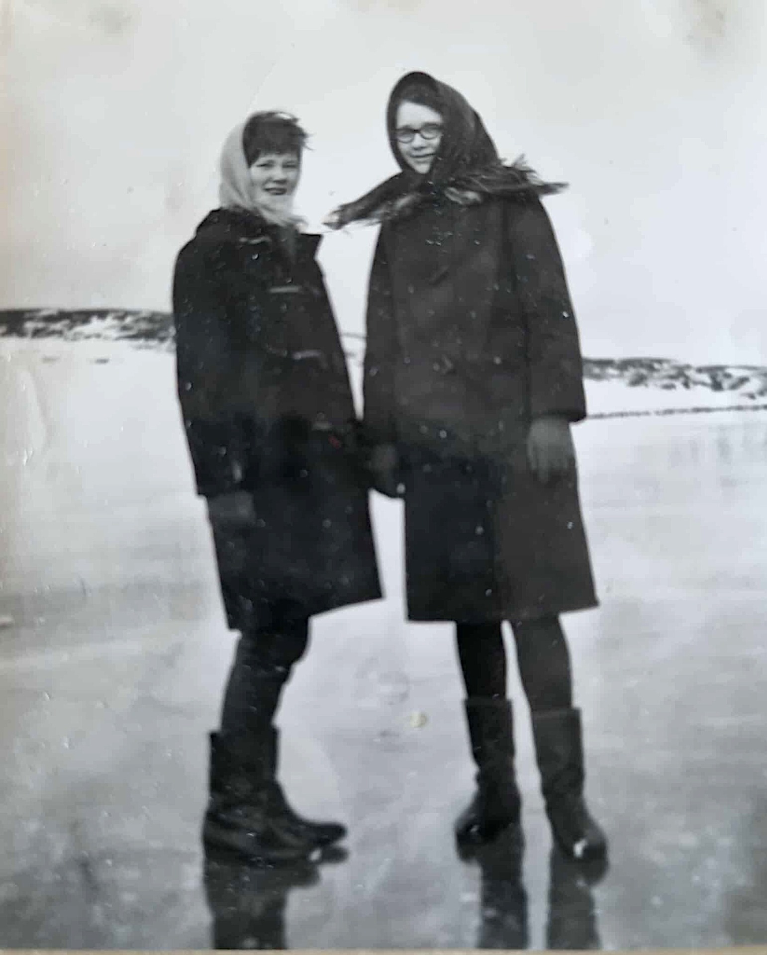 Jenter på islagt vannbasseng, bildet tilhører Torill Ingilæ Svendsen, hun har fotografert venninnene Asveig Dørmænen fra Bugøynes og Evy Jerijærvi fra Munkefjord.